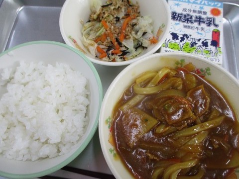 今日のメニューは…カレーうどん・和風サラダにはひじきが入っていましたゴマ風味のドレッシングも美味しかったです。