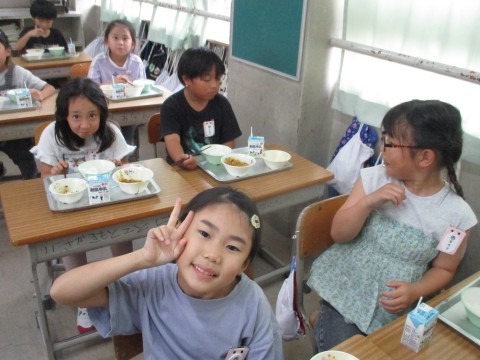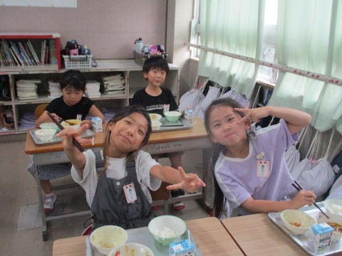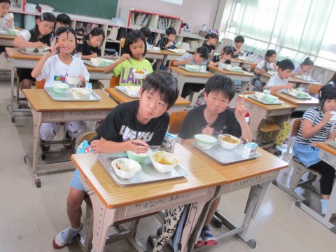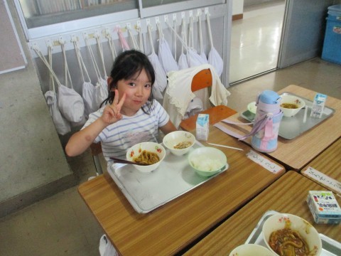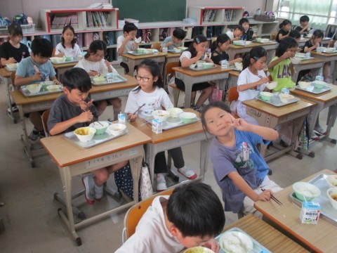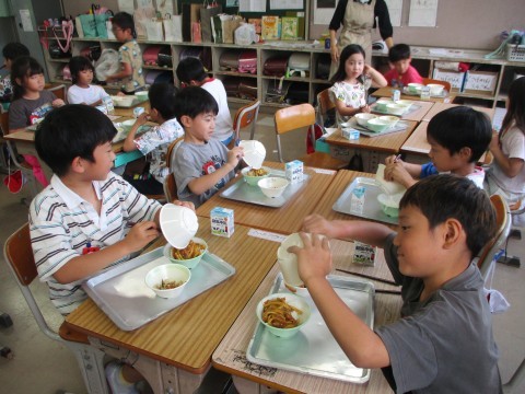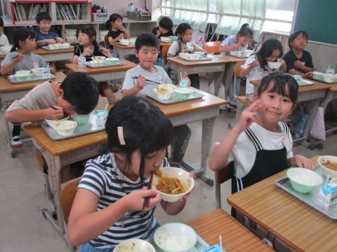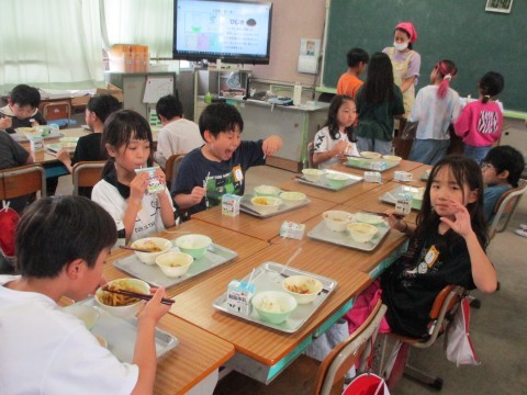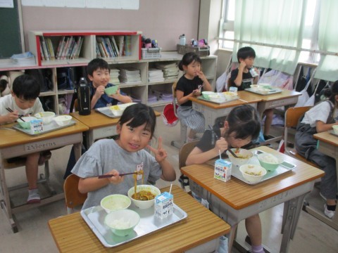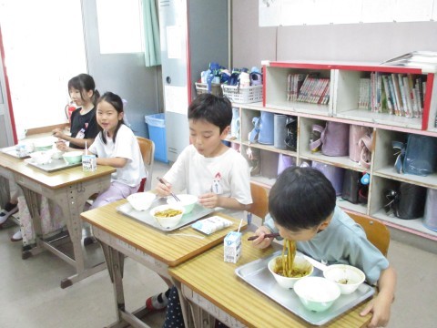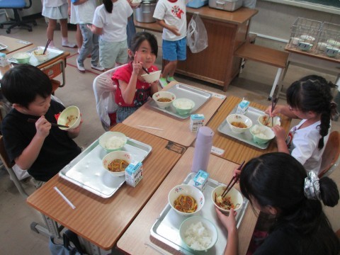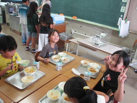 今日はカレーうどん。カレーうどんをご飯にかけて食べている子も。