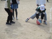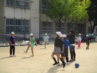 保育園の幼児さんたちが運動会の練習で小学校に来ています。一緒に鉄棒したり追いかけっこしたり楽しそうです。