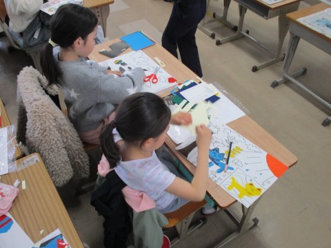 図工で作品を仕上げています。彩りがとてもきれいです。