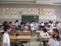 白紙に8等分の折り目を入れて、自分の名前を書く練習をしています。色鉛筆で名前のまわりに絵を描きます。素敵な名刺ができています。書き終わった人から読書タイムです。図鑑を見る。国語の教科書を見る。それぞれ自分が選び、読書に夢中になる時間です。