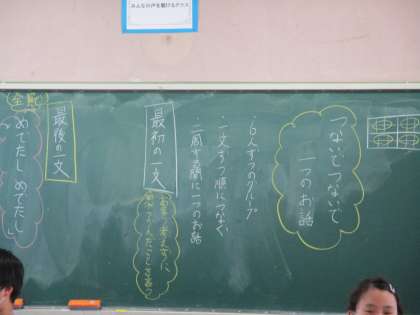 「つないでつないで一つのお話」の学習で,班の中で順番を決めて一文ずつ作り,班で1つのお話を作りました。