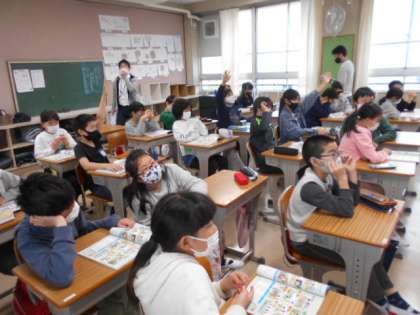 「6年生の英語の授業を知ろう」をめあてに,外国語の担当の先生と初めての英語の授業。テキストをもとに楽しそうな授業でした。きっと,子どもたちは,外国語が好きになると思います。