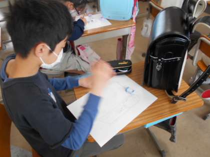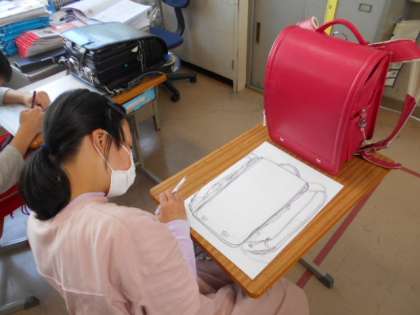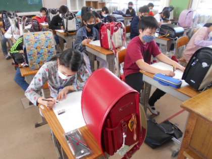 図工で「ランドセル」を画用紙いっぱいに描きました。下書きの後は,色を塗って仕上げます。6年間お世話になったランドセル。どんな作品に仕上がるか楽しみです。