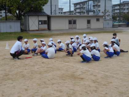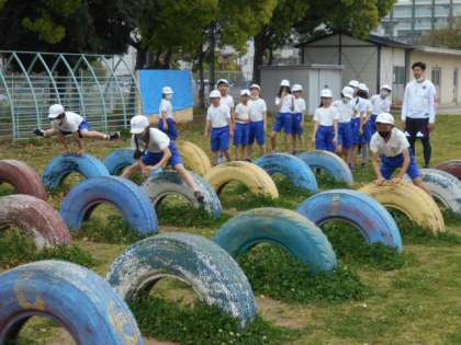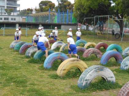 50m走が終わった後,整理運動でタイヤ飛びをしました。走った後もしっかり体を動かしていました。元気です。