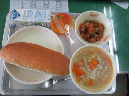 本日の献立は,コッペパン,ミルク,カンジャ,フェイジョアーダ,フルーツゼリーの5品で,ポルトガル料理にちなんだものです。