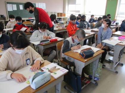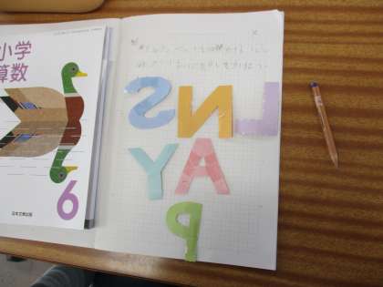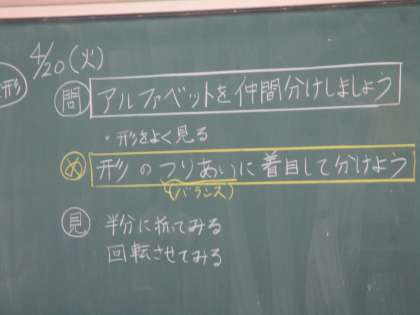 アルファベットの形に切り取った紙を重ねたり回転させたりして,形の仲間分けをしました。ここから天体しょな図形や点対称の図形を学習します。