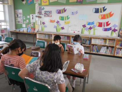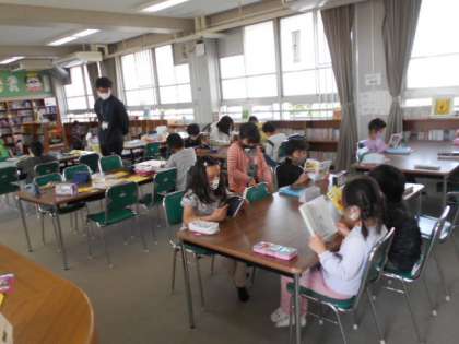 図書の時間。図書室をのぞいてみると,静かな雰囲気で本を読んでいました。さすが,3年生の子どもたちです。図書係の子どもたちもがんばってくれていました。