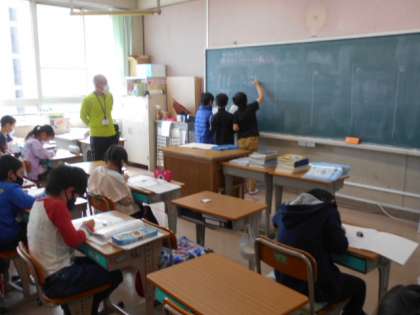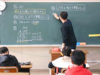 「三桁のかけ算の筆算」に取り組みました。今日のめあては「大きい数のかけ算をしよう」。「345×187」にチャレンジ。3年生で学習したことを思い出しながら,計算の仕方を考えました。先生問題にもしっかり取り組んでいました。