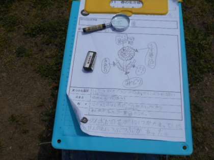 運動場で「春の生き物さがし」をしました。「だんごむし」「てんとうむし」「タンポポ」など…いろいろな生き物を発見。観察カードにしっかり記録していました。