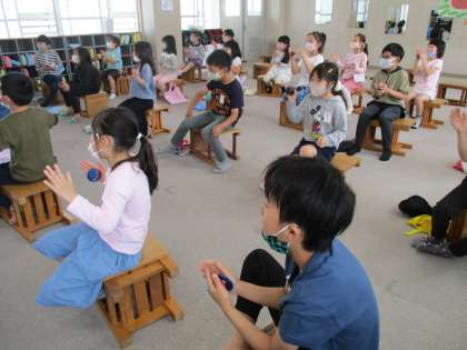「BINGO(ビンゴ)」をカスタネットを打ちながら楽しく歌いました。