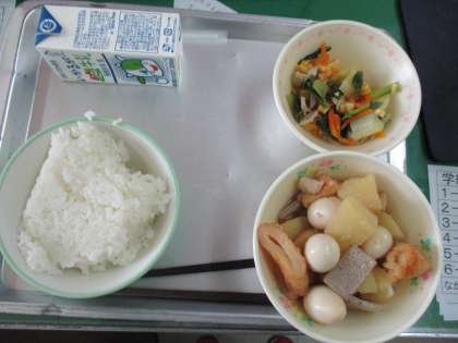 本日の献立は,ごはん,ミルク,おでん,小松菜サラダの5品です。
