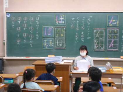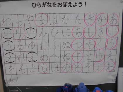 教室におじゃますると,連絡帳を書いていました。どの子も一生懸命取り組む姿に成長を感じ,うれしかったです。後ろには「ひらがな表」に習ったひらがなに丸がついていました。今日は「ほ」と「ん」を勉強しました。