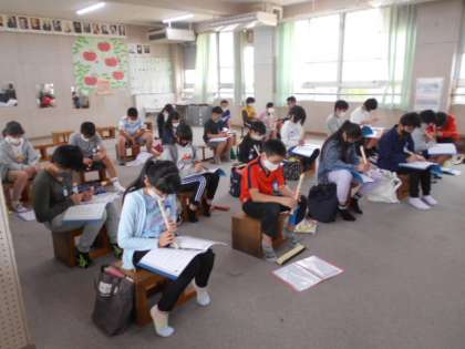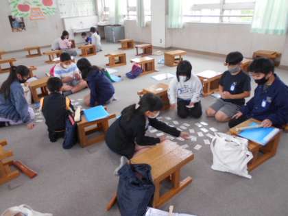 今,音楽では「日本の曲のメドレー」をリコーダーで取り組んでいます。「おぼろづきよ」「とんび」など…日本の名曲のメドレーです。練習の待ち時間,「音楽かるた」で音楽の記号や音符などを楽しく勉強していました。
