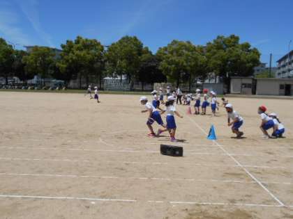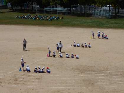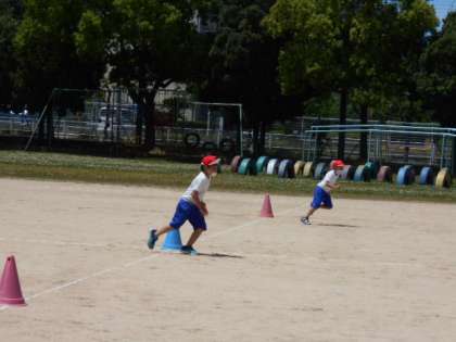 体育で「折り返しリレー」をチームに分かれてやりました。どのチームもみんなが全力で走り,大いに盛り上がりました。どの子も走る姿が,かっこよかったです。