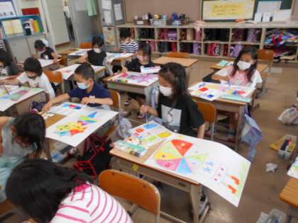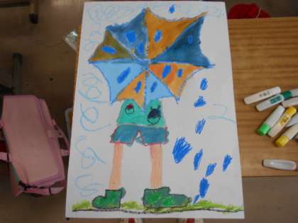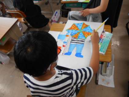 図工で「かさをさしている私」の絵に取り組んでいます。子どもたちが描いたかさは,とってもカラフルで,雨の日が楽しくなりそうです。完成が楽しみです。
