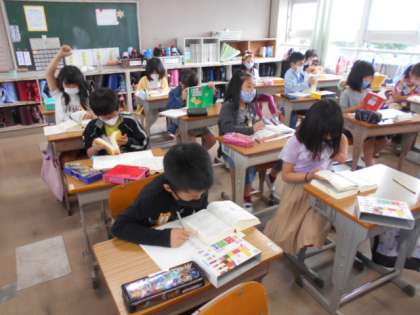 「国語辞書を使おう」を勉強しました。先生から「国語辞書」のひき方を教えてもらい,辞書を使って実際に言葉の意味を調べました。どんどんも使っていく,辞書をひくコツがわかってくると思います。
