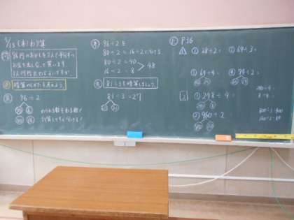 今,算数で「わり算」の勉強しています。今日のめあては「暗算にチャレンジ」。「96÷2」を暗算ができるか。サクランボ図などを使って暗算の計算の仕方を考えました。後は,練習でなれることです。