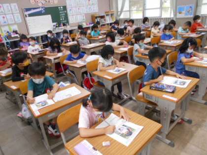 「「自己紹介カード」を作りました」(1年生) 公開日 2021/05/18 更新日 2021/05/18 1年生 生活科で「自己紹介カード」を作りました。先生に撮ってもらった写真に,「名前とすきなこと,もくひょう」を書きました。とくに,名前はどの子もしっかり書けていました。