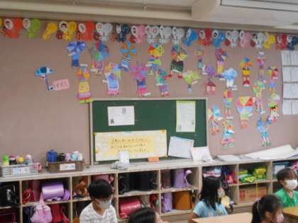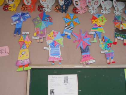 図工の「傘をさした私」の絵が完成。カラフルな傘が,雨の日を楽しくしてくれそうです。