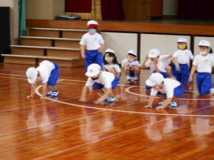 今日の体育は,体育館。「走る」活動に楽しく取り組みました。最後に,カエルトビからスタート,ゴールをめざして力いっばい走っておしまいでした。