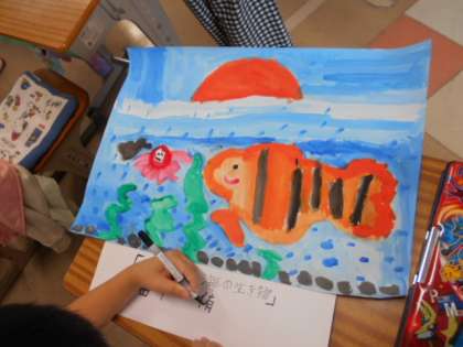 図工で描いた絵が,題名と名前をつけて完成しました。どの絵も見ていて楽しくなる作品でした。5時間目にみんなで鑑賞します。