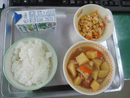 今日の献立は,ごはん,ミルク,豚肉と野菜の生姜煮,豆腐サラダ手作りドレッシング和えの4品です。