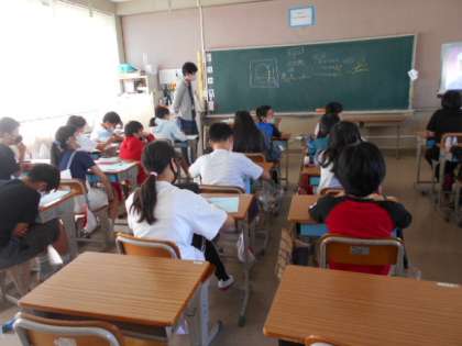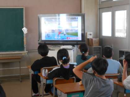 体育で「ハードル走」に取り組んでいます。1時間目は,教室で映像を見ながら「ハードル走」のとび方のポイントを確認。先生の解説もあり,ハードル走のコツがわかったようでした。