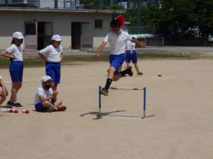 二時間目,わかったポイントを実際に試して「ハードル走」に取り組みました。前回に比べて,とぶホームが,かっこよく「ハードル走」らしくなりました。これからが楽しみです。