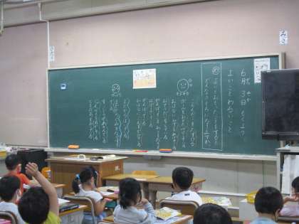 集合写真を撮ってもらいました。そのあとイラストを見てよいことと悪いことについて考えました。