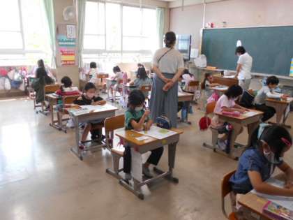 算数で「長さ」のテストをしました。テストが配られると,先生からのサポートもあって,しっかり取り組むことができていました。テストできたかな?