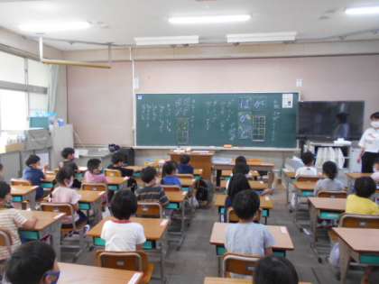 ひらがなの50音が終わり,「が」「ぱ」「っ」「ゃ」など…濁点がついた字や小さく書く字を勉強しました。今日の勉強で,ひらがなを使って表現することが広がります。後ろには,図工で作った「すきまちゃん」がかわいくならんでいました。