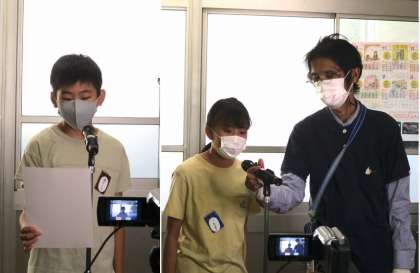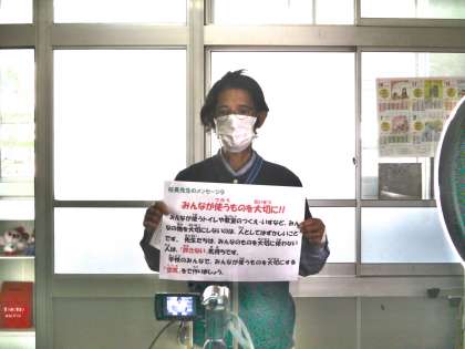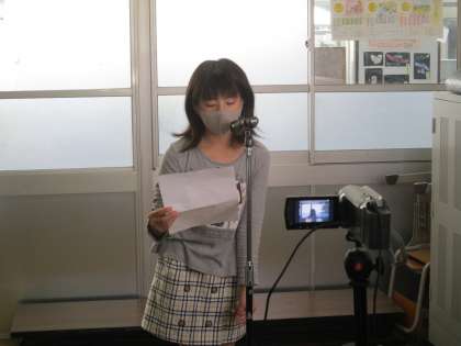 校長先生がまず,「みんなのものを大切にしよう」というテーマで話をしました。次に2年生の作文「リュックとぴんを かったで」「に年生になった」を紹介しました。最後に児童会役員がユニセフ募金の報告をしました。