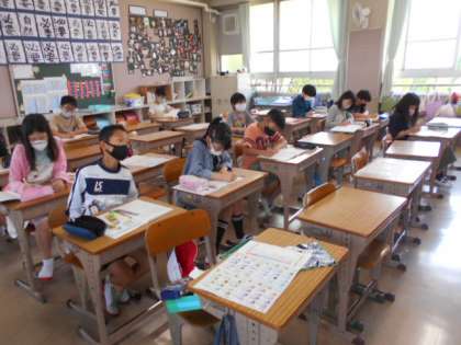 算数は「小数のかけ算」を勉強しています。今日のめあては「1.57×3.6の計算の仕方を考えよう」。ポイントは整数のかけ算で考える。そして,小数点の位置を確認。おおよその答えをから小数点の位置を考えました。計算の仕方が分かったようです。