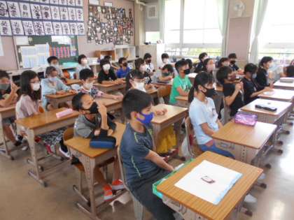 学級目標を決めました。「聴き合い」をキーワードに,目標に入れたい言葉を出し合って,グループで目標案を考えました。5年1組の学級目標,どんな目標に決まったでしょうか?