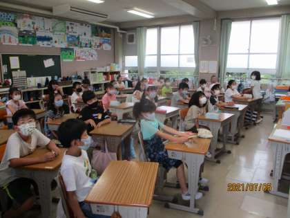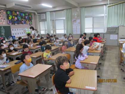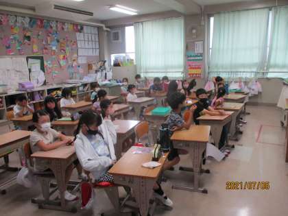 校長先生が7月10日堺空襲の話をした後,平和について語りました。そのあと4年生の作文「うっそだあ」と「鼻水がとまらない」を紹介しました。写真は1年生・2年生・3年生の様子です。