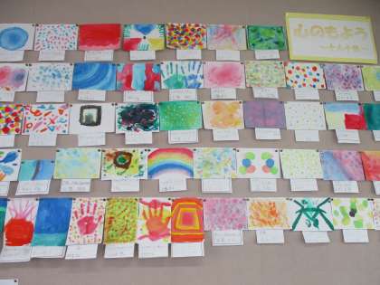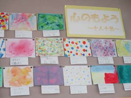 図工の作品が後ろに掲示してありました。テーマ「心のもよう〜十人十色〜」。心に感じたイメージを表現。子どもたちの心の中が少し見えたようです。