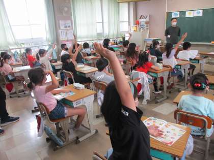 外国語の時間です。今日はNSの先生と英語の先生とで勉強しました。めあては「クラスの友だちと好きなものを伝え合おう」。「What do you like」「I like 〜」の表現を使って,好きな色や果物,食べ物などを楽しそうに伝え合いました。うまく,伝えられたかな?