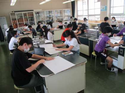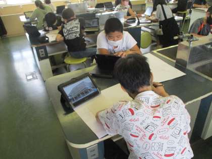 図工の時間です。今「学校の風景」に取り組んでいます。今日は,タブレットで撮った写真をもとにした絵を描きました。子どもたちがいろいろな視点から切り取った学校の風景。下絵を見ていてもできあがりが楽しみです。きっと,素敵な作品になると思います。