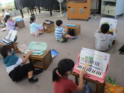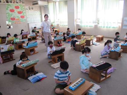 音楽の時間です。鍵盤ハーモニカに取り組みました。めあては「ドレミの場所をおぼえよう」。「ドレミ」の指使いを確認。「ドレミであいさつ」で指使いを練習しました。指使いが,うまくできるようにがんばっていました。
