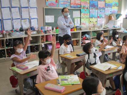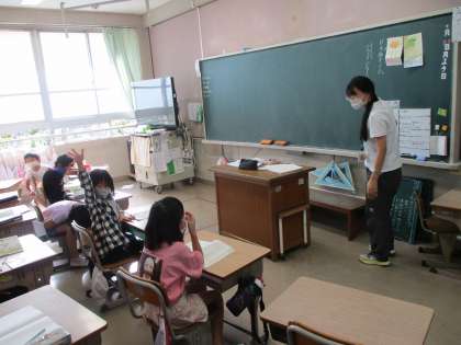 国語の時間です。今「お手紙」を勉強しています。主人公は,カエルくんとガマくん。お手紙を待っている二人が悲しそうな顔をしているのかについて話し合いました。とくに一緒にいるガマ君が,悲しそうな顔をしているのはどうして…。わかったかな?
