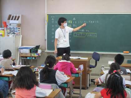 算数の時間です。「わり算」をやってます。教科書の問題にチャレンジ。あまりのあるわり算の仕方を確認。確かめ算も確認しながらしっかり取り組んでいました。