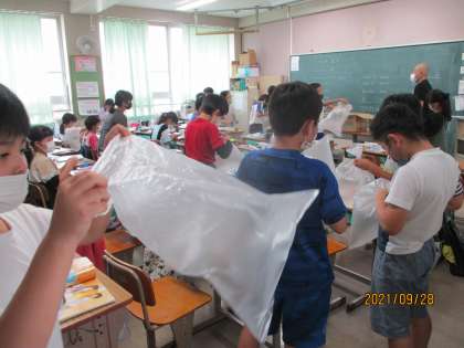 ビニル袋に空気を閉じ込めて,感触や弾力を確かめました。