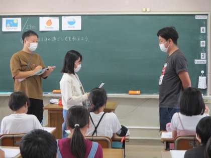 外国語の時間です。めあては「自由な一日の過ごし方を伝えよう」。前の時間に,考えた自由な一日の過ごし方を英語で表現しました。伝えたのは担任の先生。うまく伝えることができました。