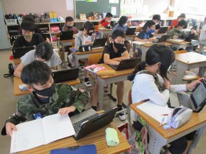 国語の時間です。「言葉の変化」を勉強しました。「背広」は「スーツ」,「喫茶店」は「カフェ」など…時代による言葉のちがいをタブレットで調べました。その結果は,次の時間,発表します。どんな言葉の変化があるのか?楽しみです。