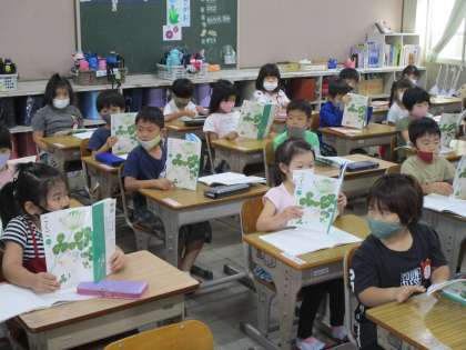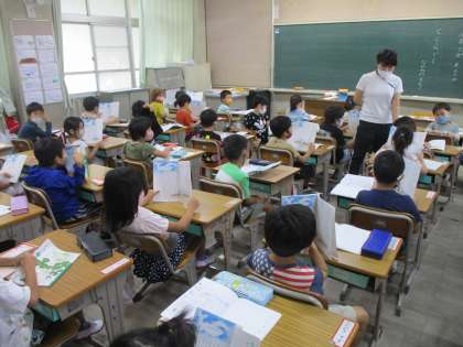 国語の時間です。「くじらぐも」を勉強しています。はじめに,一人ずつ音読をしました。先生のアドバイスをもらいながら,しっかり声を出して読むことができていました。