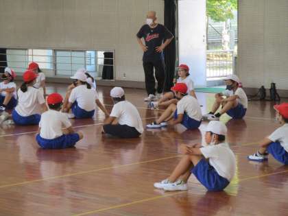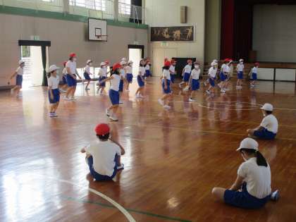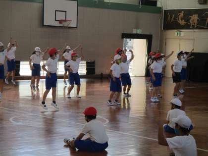 体育の時間です。運動会のダンスの練習に取り組みました。今日は,今までの練習の成果を3,4年生でお互いに見せ合いました。どたらも練習の成果を出せて,かっこよく踊ることができました。感想もいいポイントをお互いに交流できました。
