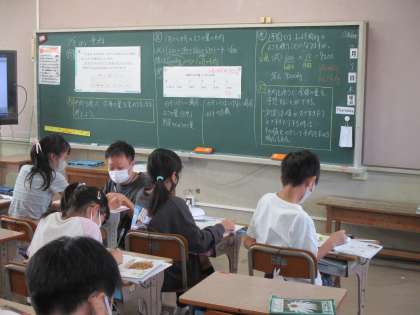 算数の時間です。「平均」の勉強をしています。めあては「平均を使って,全体の量を求める方法を考えよう」。わかったポイントは「平均を使うと,全体の量を予想することができる」。平均のよさを一つ知りました。