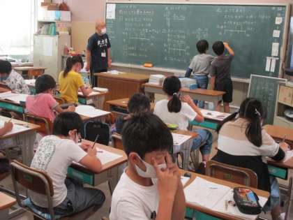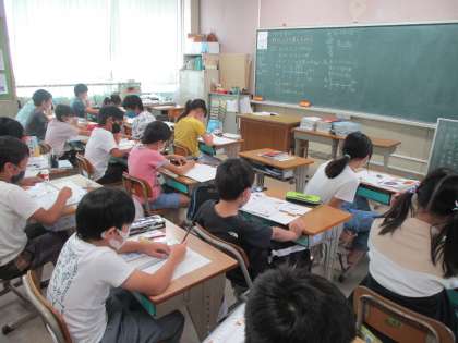 算数の時間です。「もとにする量を求めよう」を勉強しました。数直線を使うと分かりやすく求めることができると分かったようです。この学習が,高学年の「割合」につながる大切な勉強になります。
