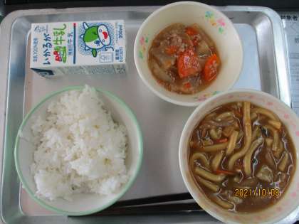 本日の献立は,ごはん,ミルク,カレーうどん,大根のそぼろ煮の4品です。